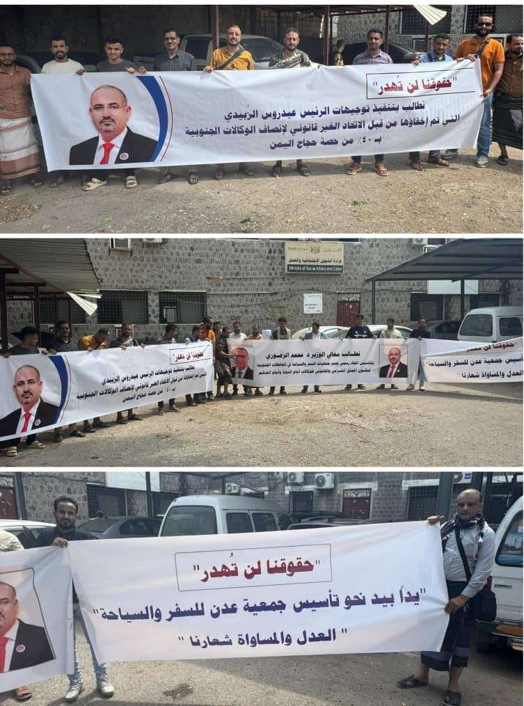 كما دعا المحتشدون معالي الوزير إلى تنفيذ ما ورد في مذكرته السابقة بحذافيرها وذلك عبر إيقاف أي محاولات لتصحيح أو تقنين ما يسمى بالاتحاد وعدم الاعتداد به ثم الشروع في تحويله إلى جمعية كما نصت المذكرة يلي ذلك فتح إجراءات تأسيس اتحاد سياحي قانوني للمحافظات الجنوبية يقوم على الجمعيات المرخصة فقط وليس عبر الوكالات أو الأفراد وأكد المحتشدون أن هذا المسار هو الضمان الحقيقي لحماية حقوق الوكالات الجنوبية وتنظيم القطاع بما يخدم المصلحة العامة بعيدا عن أي كيانات غير قانونية أو فاقدة للشرعية وطالب المحتجون أيضا بضرورة إظهار وتفعيل توجيهات الرئيس عيدروس الزبيدي التي نصت صراحة على منح الوكالات الجنوبية ما نسبته 40٪ من إجمالي حصة حجاج اليمن وهي التوجيهات التي أخفتها الهيئة الإدارية لما يسمى بالاتحاد السياحي اليمني غير الشرعي في التفاف واضح وفاضح بهدف استغلالها لتحقيق مصالح شخصية وأكد المشاركون أن هذا الملف تم طرحه مسبقا أمام معالي الوزير الدكتور محمد الزعوري مشيرين إلى أن تلك التوجيهات الرئاسية تمثل استحقاقا قانونيا ووطنيا عادلا للوكالات الجنوبية يتوجب تنفيذه دون تأخير ورفع المشاركون خلال الوقفة لافتات وشعارات تعبر عن رفضهم للعبث، منها.