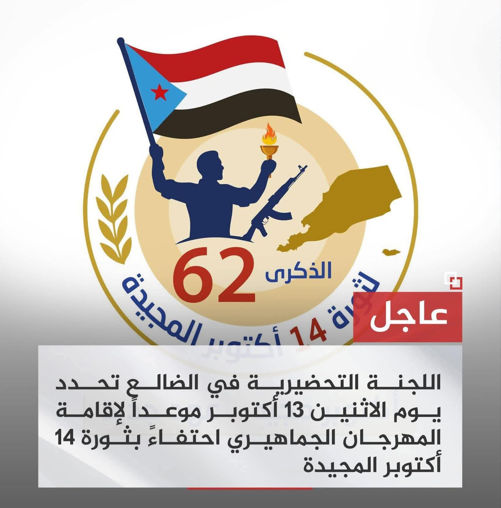 استجابةً لدعوة الرئيس القائد عيدروس قاسم الزُبيدي، التي دعا فيها جماهير شعبنا إلى إحياء الذكرى الثانية والستين لثورة الرابع عشر من أكتوبر المجيدة في كلٍ من الضالع وحضرموت، أقرت اللجنة التحضيرية بمحافظة الضالع إقامة المهرجان الجماهيري بهذه المناسبة الوطنية الخالدة يوم الاثنين الموافق 13 أكتوبر 2025م في محافظة الضالع، تحت شعار “أكتوبر مجيد.. عهد جديد”.