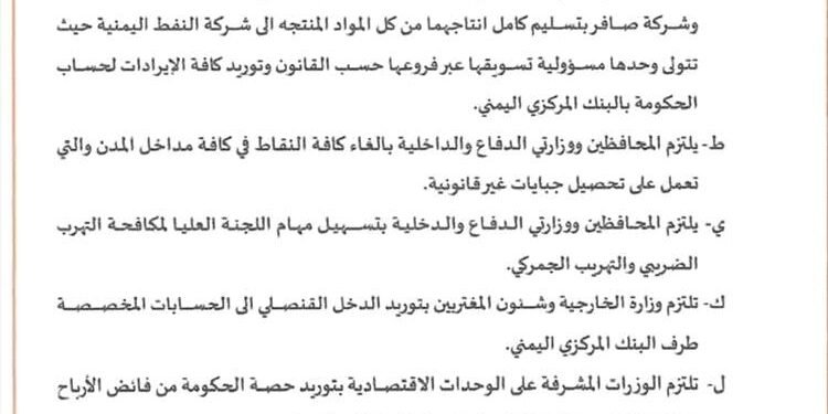 تكشف وثيقة صادرة عن مجلس القيادة الرئاسي الجهات المتخلفة عن التوريد الى البنك المركزي : شركة النفط اليمنية ، المحافظون ، الشركة اليمنية لتكرير النفط ، بترومسيلة ، شركة صافر ، وزارة الخارجية ، الوزارات المشرفة على الوحدات الاقتصادية ومطالبة كل هذه الجهات بتوريد حصة الحكومة.
